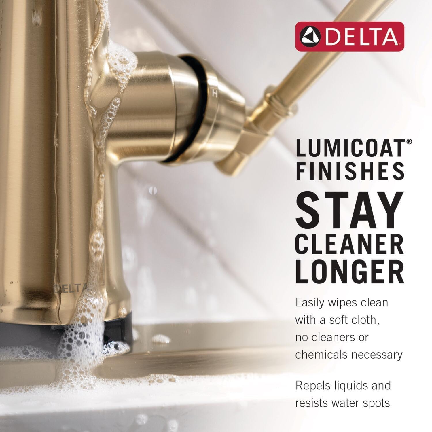 The defined ridges of the Emmeline Kitchen Collection’s diamond-shaped spout cut a streamlined profile, balanced by captivating details that lend an elemental sense of old-world flair. Delta Touch2O faucets with Touchless Technology help keep germs and mess off your kitchen faucet and provides easy water control 3 ways: simply place your hand near the faucet, tap the faucet surface, or use standard handle activation. The TempSense LED light changes color to alert you to the water’s temperature and eliminate any possible surprises or discomfort. MagnaTite Docking uses a powerful integrated magnet to pull your faucet spray wand precisely into place and hold it there so it stays docked when not in use. Delta faucets with Diamond Seal Technology perform like new for life with a patented design which reduces leak points, is less hassle to install and lasts twice as long as the industry standard. You can install with confidence, knowing that Delta faucets are backed by our Lifetime Limited Warranty.